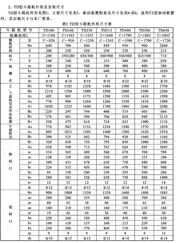 二、TD型斗式提升機(jī)(一)技術(shù)性能(表2)(二)主要結(jié)構(gòu)1、TD型斗提機(jī)結(jié)構(gòu)型式(1)傳動裝置 TD型斗提機(jī)的傳動裝置有兩種形式,分別配有YZ型減速器或ZQ(YY)型減速器。YZ型軸裝減速器直接套裝在主軸軸頭上,省去了傳動平臺、聯(lián)軸器等,便結(jié)構(gòu)緊湊,重量輕,而且其內(nèi)部帶有異型輥逆止器,逆止可靠。該減速器噪聲低,運(yùn)轉(zhuǎn)平穩(wěn),并隨主軸浮動,可消除安裝應(yīng)力。(2)TD型斗提機(jī)備有四種料斗Q型(淺斗)、H型(弧底斗)、ZD型(中深斗)、SD型(深 斗)表2 TD型斗提機(jī)技術(shù)性能