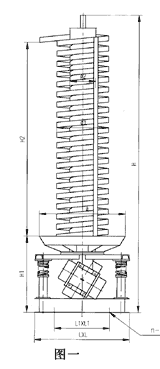 ZC系列垂直振動輸送機的驅動裝置振動電機安裝在輸送塔下部,兩臺振動電機對稱交叉安裝,輸送塔由管體和焊接在管體周圍的螺旋輸送槽組成,輸送塔座于減振裝置上,減振裝置由底座和隔振彈簧組成。 (見圖一)